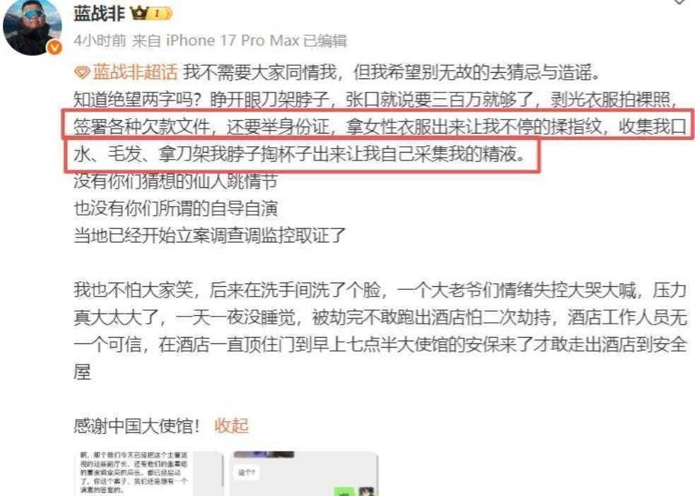 前几天旅游博主蓝战非在酒店遇到三个人闯进他的房间,他们拿着房卡直接开门,自称是粉丝,还说是“黑哥”,跟当地有关系,假装成执法人员,他们不让蓝战非离开,关了五个小时,拿走了他的头发和体液,还用他的手机转了钱,警察来了也没抓到人,这件事听起来像电影情节,但真的发生了,关键是这些人提前半年做准备,利用酒店系统的漏洞,打着合作的幌子做这些事。